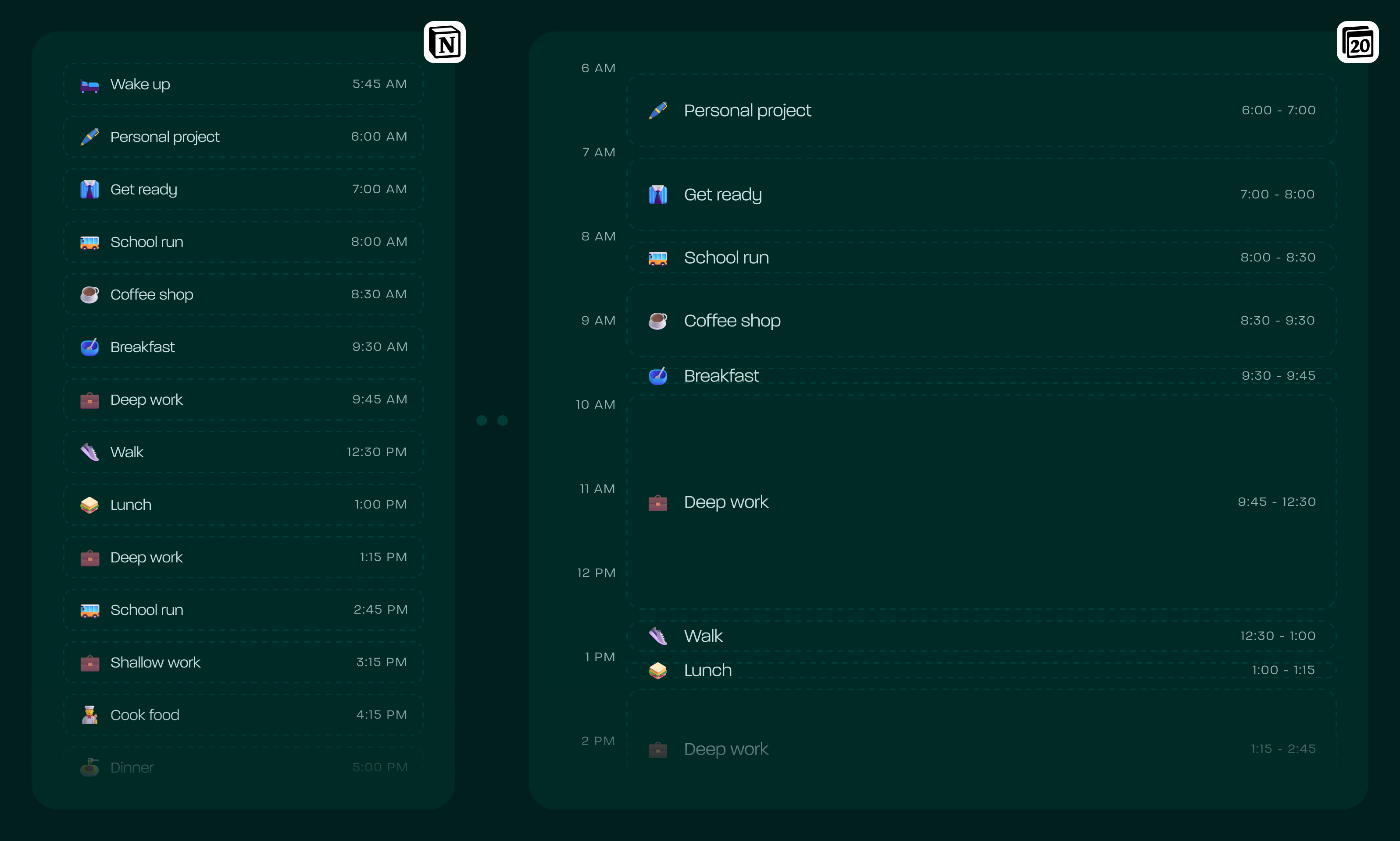 5:45 - 6:00 ——— 🛏️ Wake up 6:00 - 7:00 ——— 📑 Personal project 7:00 - 8:00 ——— 👔 Get ready 8:00 - 8:30 ——— 🚌 School run 8:30 - 9:30 ——— ☕️ Coffee shop 9:30 - 9:45 ——— 🥣 Breakfast 9:45 - 12:30 —— 🎒 Deep work 12:30 - 1:00 —— 👟 Walk 1:00 - 1:15 ——— 🌯 Lunch 1:15 - 2:45 ——— 🎒 Deep work 2:45 - 3:15 ——— 🚌 School run 3:15 - 4:15 ——— 🎒 Shallow work 4:15 - 5:00 ——— 👨🍳 Cook food 5:00 - 5:15 ——— 🍲 Dinner 5:15 - 7:30 ——— 👧 Family time 7:30 - 8:15 ——— 🏋 Weight training 8:15 - 8:45 ——— 🛁 Bath 8:45 - 9:00 ——— 📔 Journal 9:00 - 9:30 ——— 😌 Relax 9:30 - 5:45 ——— 🛌 Sleep